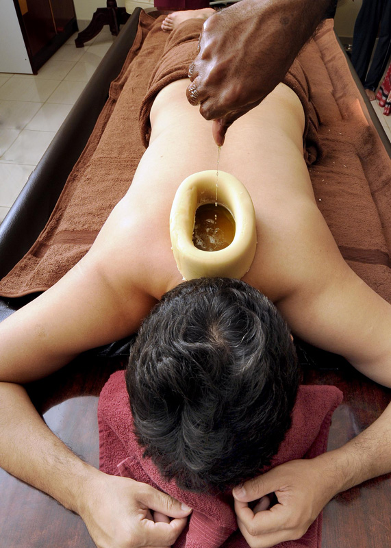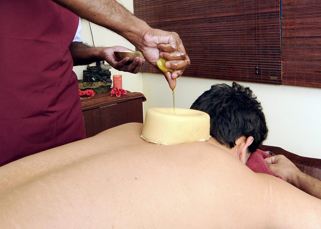 A damn is built on the neck using wheat flour or Black Gram flour, it is then filled with warm medicated oil. This is excellent for people with neck pain due to stress.