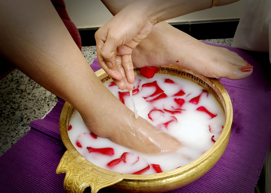 Massaging the feet not only helps on the detoxification of the body but also helps in balancing the emotions and improving the blood and lymph flow circulation. When the specific oil is massaged onto the feet with a focus on the energy points, in cyclic & long motions the massage helps in relaxing and lightening the lower extremities and provides physical relief and swelling. With the stimulation of these energy points, the Ayurvedic foot massage helps in treating sleeplessness, builds up blood circulation and preserves good eyesight.